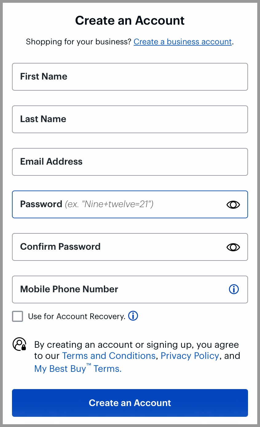 1) Using Safari, go to the website you wish to log in to or create an account for and navigate to their sign in or account creation page. For this example, we will create a new account.